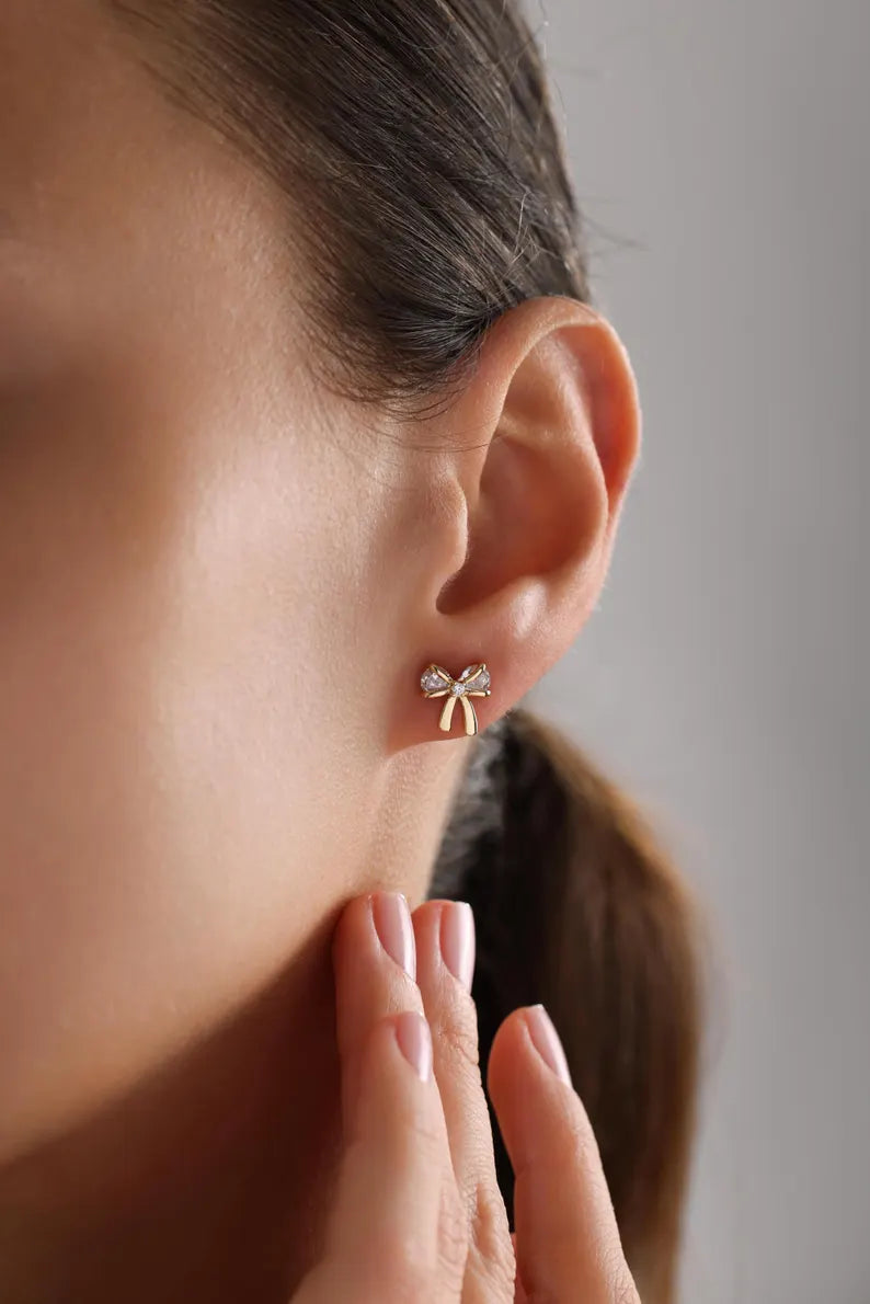 Delicate gold bow stud earrings with a subtle sparkle, designed to add a touch of elegance and charm. Lightweight and timeless, perfect for everyday wear or special occasions.